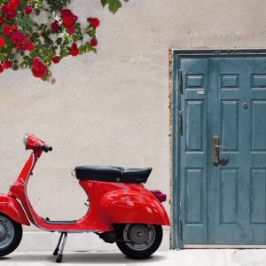 کاغذ دیواری پوستر موتور سیکلت وسپا قرمز کلاسیک قدیمی جلوی درب سبز چوبی و گلهای قرمز